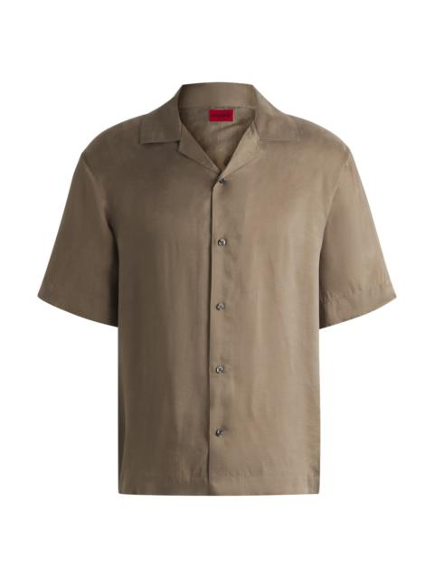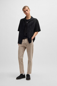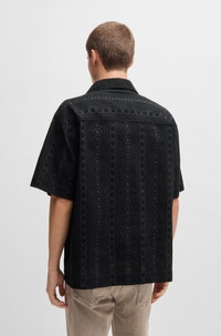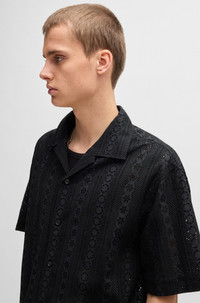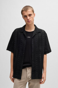 SIZE AND FIT The model wears a size M and is 6'2" tall with a, 35" chest, 27" waist and 35" hips. DETAILS Espino - 50539344 Freshen up your summer options with this HUGO Menswear shirt. Easy-wear loose fit. Made in airy cotton with distinctive embroidery all over. Oversized fit Reverse lapels Short length Fit back length: 72 cm (28 inches) QUALITY & CARE INSTRUCTIONS Do Not Bleach Do Not Tumble Dry Quality: 100% Cotton Do Not Dry Clean Iron Low Heat Machine Wash Cold Gentle