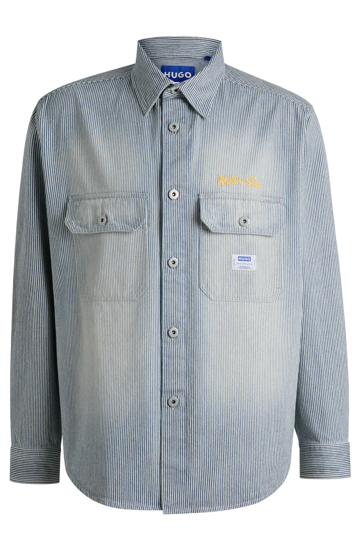 SIZE AND FIT The model wears a size M and is 6'1" tall with a, 33" chest, 25" waist and 35" hips. DETAILS Ebolt - 50539045 With authentic doughnut buttons and 'Motor Club' stitching, this HUGO Menswear oversize-fit denim shirt features stripes and a faded effect. Matching items available. Oversized fit Kent collar Flap chest pockets Barrel cuffs Long length Fit back length: 81 cm (32 inches) QUALITY & CARE INSTRUCTIONS Do Not Bleach Do Not Tumble Dry Iron Medium Heat Quality: 100% Cotton Do Not Dry Clean Machine Wash Cold Gentle