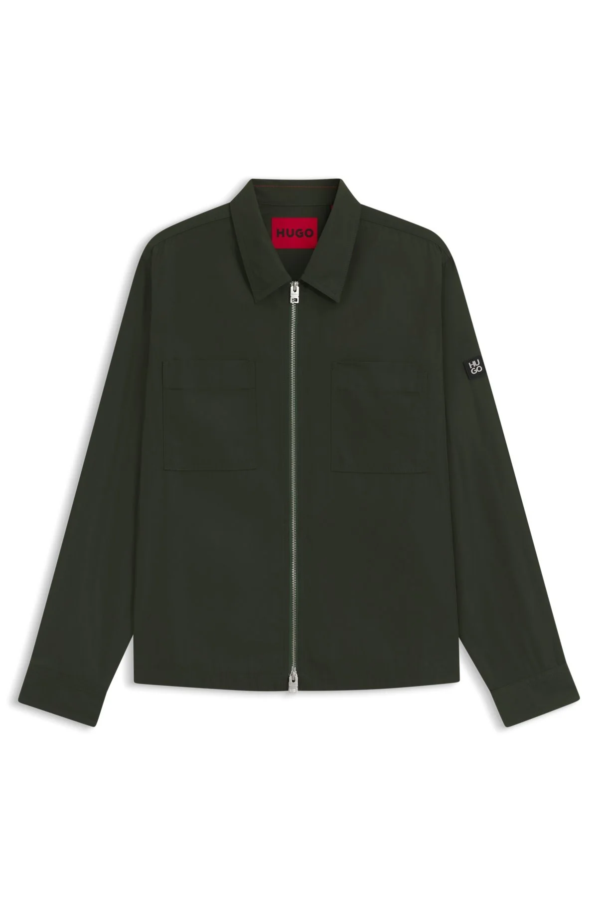 DETAILS Evalom - 50545327 This water-repellent HUGO Menswear shirt offers protection and contemporary appeal. Laid-back fit. Modern zip-up front. Stacked-logo trim on the sleeve. Oversized fit Camp collar Patch chest pockets Barrel cuffs Short length Fit back length: 68 cm (27 inches) QUALITY & CARE INSTRUCTIONS Quality: 100% Polyester Do Not Dry Clean Do Not Tumble Dry Machine Wash Cold Do Not Bleach Iron Low Heat