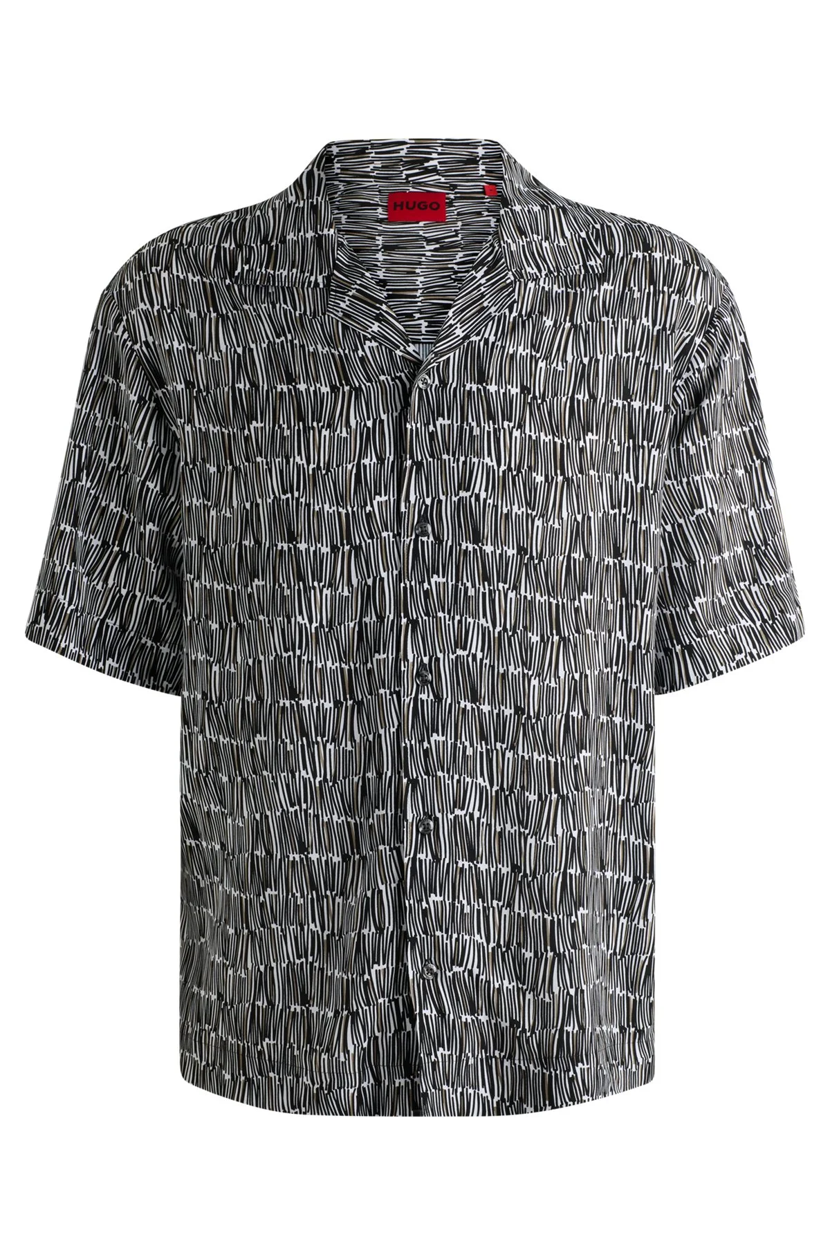 DETAILS Espino - 50539217 Cut to a roomy fit with a fluid feel, this HUGO Menswear shirt is a fresh option for summer. Printed with an abstract motif. Oversized fit Reverse lapels Short length Fit back length: 72 cm (28 inches) QUALITY & CARE INSTRUCTIONS Do Not Dry Clean Iron Low Heat Do Not Bleach Quality: 100% Viscose Do Not Tumble Dry Machine Wash Cold