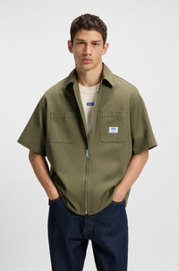 SIZE AND FIT The model wears a size M and is 6'2" tall with a, 36" chest, 28" waist and 36" hips. DETAILS Ekyz - 50545166 With its utility styling and zip front, this HUGO Menswear shirt is a fresh option for your casual collection. Soft cotton twill. Roomy fit. Oversized fit Camp collar Patch chest pockets Short length Fit back length: 73 cm (29 inches) QUALITY & CARE INSTRUCTIONS Do Not Bleach Do Not Dry Clean Quality: 100% Cotton Machine Wash Cold Do Not Tumble Dry Iron Low Heat