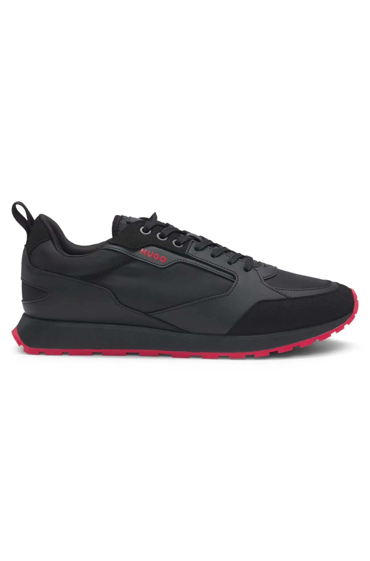 DETAILS Icelin_Runn_pumf_N - 50536568 Sporty trainers by HUGO. This retro-inspired pair is crafted in a mix of materials with a rubber base on a lightweight EVA outsole. Laces Fully lined Packaging: Box QUALITY & CARE INSTRUCTIONS Upper material: 100% Polyester, Lining: 100% Polyester, Sole: 75% Ethylene vinyl acetate, 25% Rubber, Facing: 50% Polyurethane, 55% Polyurethane, 50% Polyamid, 45% Polyester, Innersole: 100% Polyester