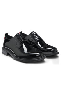 DETAILS Featuring a subtle embossed logo, these HUGO Menswear Derby shoes add polish to your formal looks with their patent-leather uppers. Distinctive zigzag detail. Sole: Other material Fully lined Laces Packaging: Box Lysander_derb_ptlt - 50552608 QUALITY & CARE INSTRUCTIONS Upper material: 100% Cow leather, Lining: 100% Polyester, 60% Polyester, 40% Polyurethane, Sole: 100% Thermoplastic polyurethane , Innersole: 60% Polyester, 40% Polyurethane
