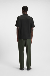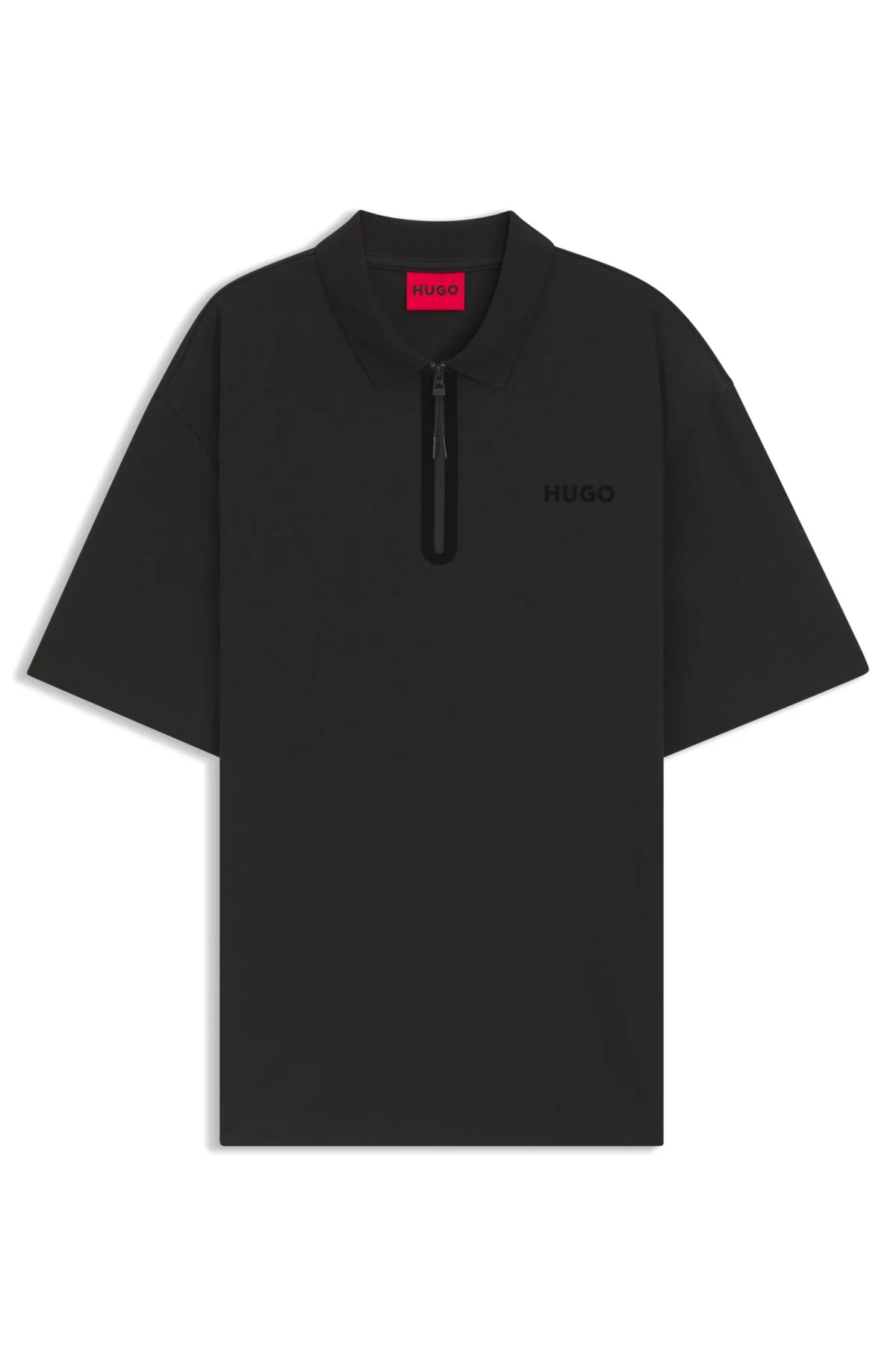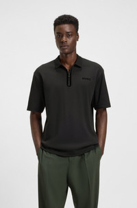 SIZE AND FIT The model wears a size M and is 6'2" tall with a, 35" chest, 27" waist and 35" hips. DETAILS Dubilo - 50542313 In a relaxed fit with a zip placket, this HUGO Menswear polo shirt is a modern casual option. Comfortable stretch-cotton. Decorative reflective details. Relaxed fit Neckline: Polo collar Fastening top: Zip closure Short sleeves No cuffs Standard length QUALITY & CARE INSTRUCTIONS Do Not Tumble Dry Do Not Dry Clean Machine Wash Cold Gentle Iron Low Heat Quality: 55% Cotton, 40% Polyester, 5% Elastane, Collar: 97% Cotton, 3% Elastane Do Not Bleach