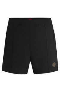 SIZE AND FIT The model wears a size M and is 6'1" tall with a, 33" chest, 25" waist and 35" hips. DETAILS Rudo252 - 50534646 Easy-wear shorts by HUGO Menswear, designed with side slits and an elasticated waist for comfort. Soft-touch poplin. Geometric logo print. Regular fit. This product is partly created with polyester. Regular fit Regular rise Elastic Waistband Straight leg Pockets bottom front: Zip pockets Cropped QUALITY & CARE INSTRUCTIONS Do Not Tumble Dry Do Not Bleach Quality: 100% Polyamide, pocketing: 65% Polyester, 35% Cotton Machine Wash Cold Gentle Reduced Dry Clean Iron Low Heat