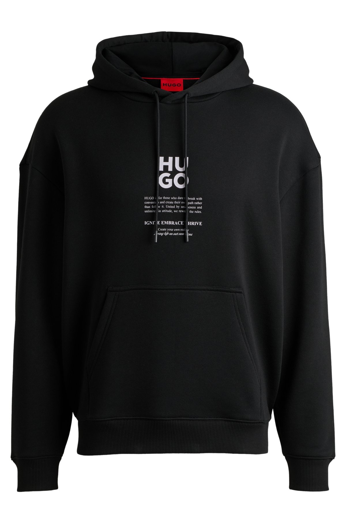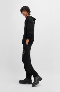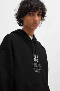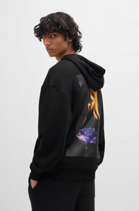 SIZE AND FIT The model wears a size M and is 6'2" tall with a, 33" chest, 29" waist and 35" hips. DETAILS Dflohood - 50521288 An oversize-fit hoodie with signature messaging by HUGO. Crafted in cotton, this piece features flame-floral artwork on the back. Oversized fit Neckline: Hooded Long sleeves Ribbed cuffs QUALITY & CARE INSTRUCTIONS Quality: 70% Cotton, 30% Polyester, Lining: 100% Cotton Do Not Tumble Dry Do Not Bleach Machine Wash Cold Gentle Iron Low Heat Do Not Dry Clean