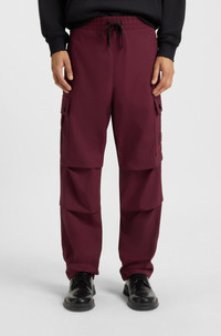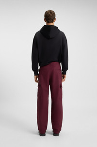 DETAILS Garlo233 - 50493865 Regular-rise trousers cut to a straight fit with a tapered leg by HUGO Menswear, featuring buttoned cargo pockets and a red logo label. Slim fit Regular rise Elastic Waistband Tapered leg Pockets bottom front: Side slash pockets Pockets bottom back: Welt pocket QUALITY & CARE INSTRUCTIONS Do Not Tumble Dry Machine Wash Cold Gentle Quality: 100% Cotton, pocketing: 65% Polyester, 35% Cotton Reduced Dry Clean Iron Low Heat Do Not Bleach