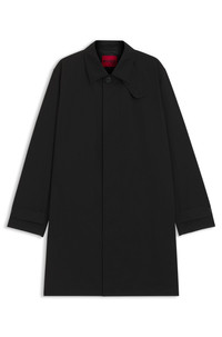 SIZE AND FIT The model wears a size L and is 6'3" tall with a, 35" chest, 31" waist and 35" hips. DETAILS Maver2431 - 50517771 A minimalist coat, with a throat latch and concealed closure, by HUGO Menswear. This regular-fit piece is crafted in water-repellent gabardine. Regular fit QUALITY & CARE INSTRUCTIONS Iron Low Heat Do Not Wash very mild professional wet clean Do Not Bleach Do Not Tumble Dry Quality: 65% Polyester, 35% Cotton, Lining: 100% Polyester Do Not Dry Clean