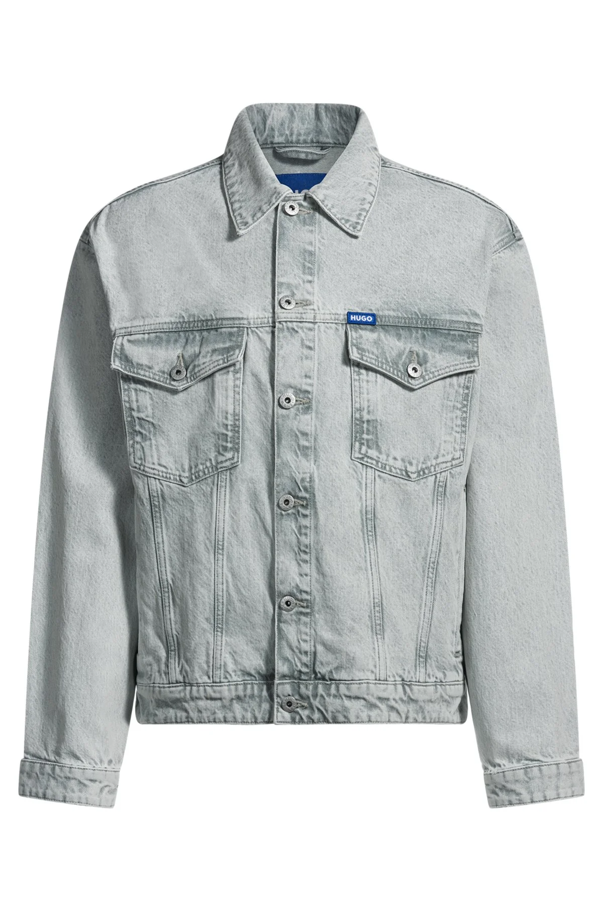 SIZE AND FIT The model wears a size M and is 6'2" tall with a, 35" chest, 27" waist and 35" hips. DETAILS Dex - 50534538 This HUGO Menswear jacket has authentic trucker styling and a straight fit for easy layering. Modern light-gray denim with a green tint. Regular fit Shirt Collar Flap chest pockets Pockets top: Welt pockets Button cuffs Standard length QUALITY & CARE INSTRUCTIONS Iron Medium Heat Quality: 100% Cotton, pocketing: 100% Cotton Do Not Dry Clean Do Not Bleach Machine Wash Cold Gentle Do Not Tumble Dry