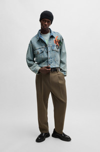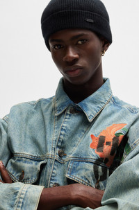 SIZE AND FIT The model wears a size M and is 6'1" tall with a, 33" chest, 27" waist and 36" hips. DETAILS HUGO 097 - 50518013 A statement jacket in a regular fit by HUGO. Featuring stacked logos on floral artwork, this style is crafted in blue rigid denim. This product is partially made with cotton. The largest volume of cotton comes from pre-consumer waste – for example, in textile production. The aim of using materials is to save resources. Regular fit Shirt Collar Patch chest pockets Button cuffs QUALITY & CARE INSTRUCTIONS Machine Wash Cold Gentle Iron Medium Heat Do Not Bleach Quality: 100% Cotton (20% recycled), pocketing: 65% Polyester, 35% Cotton Do Not Tumble Dry Do Not Dry Clean