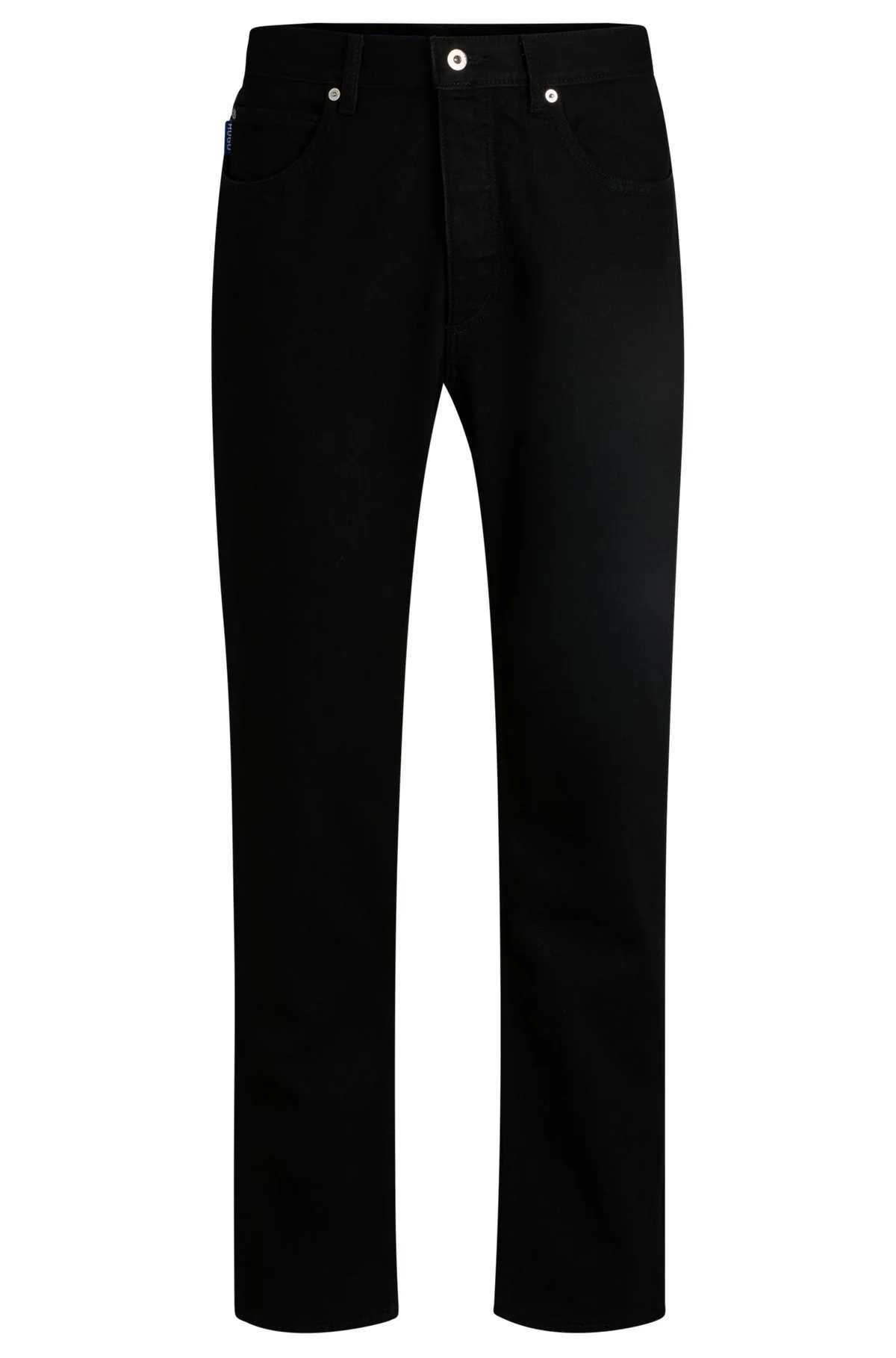 SIZE AND FIT The model wears a size 32/32 and is 6'0" tall with a, 33" chest, 27" waist and 35" hips. DETAILS Jonah - 50511485 Straight-fit jeans with signature trims by HUGO Menswear. This pair is crafted in denim with a black wash. Elevate your weekend with this staple. Regular fit Regular rise Button and zip closure Pockets bottom front: Side pockets Straight leg Pockets bottom back: Patch pocket Standard length Fit foot width: 40,0 cm (15.7 inches) QUALITY & CARE INSTRUCTIONS Iron Medium Heat Quality: 100% Cotton, pocketing: 100% Cotton Do Not Tumble Dry Do Not Bleach Machine Wash Cold Gentle Do Not Dry Clean