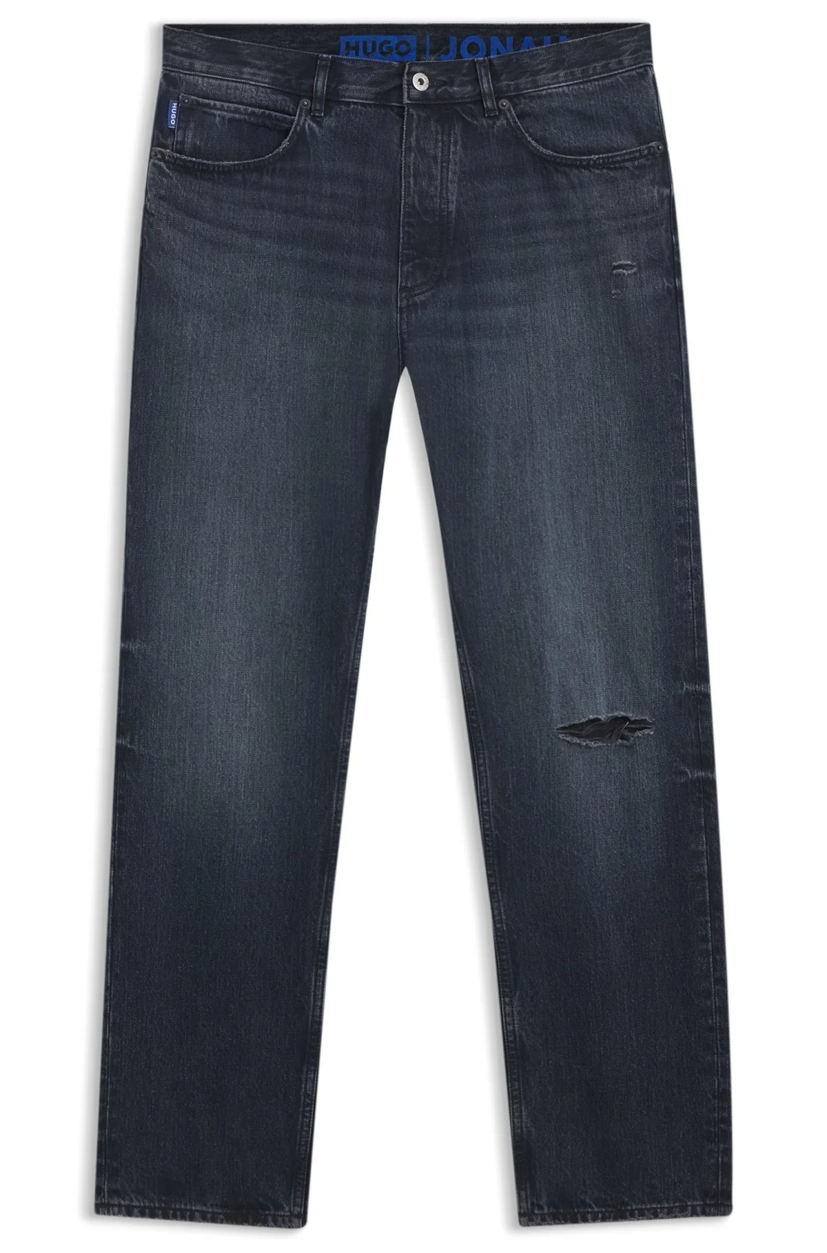 SIZE AND FIT The model wears a size 32/32 and is 6'2" tall with a, 35" chest, 27" waist and 35" hips. DETAILS In authentic dark blue with five-pocket styling, these HUGO Menswear jeans are an easy casual foundation. Straight fit. Stretch denim with distressing. Regular fit Regular rise Button and zip closure Pockets bottom front: Side pockets Straight leg Pockets bottom back: Patch pocket Standard length Fit foot width: 40,0 cm (15.7 inches) Jonah - 50551921 QUALITY & CARE INSTRUCTIONS Do Not Dry Clean Machine Wash Cold Gentle Do Not Bleach Do Not Tumble Dry Material: 100% Cotton, pocketing: 100% Cotton Iron Medium Heat