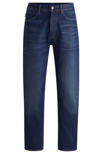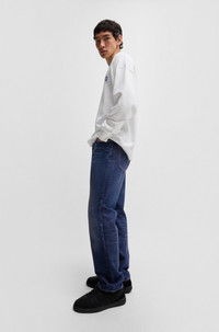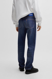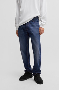 SIZE AND FIT The model wears a size 32/32 and is 6'0" tall with a, 33" chest, 27" waist and 35" hips. DETAILS Jonah - 50529177 Stonewashed jeans with a dark-blue tone and whiskers by HUGO Menswear. This regular-rise pair comes in weighty denim with a modern straight leg. Regular fit Regular rise Button and zip closure Pockets bottom front: Side pockets Straight leg Pockets bottom back: Patch pocket Standard length Fit foot width: 40,0 cm (15.7 inches) QUALITY & CARE INSTRUCTIONS Quality: 100% Cotton (20% recycled), pocketing: 100% Cotton Iron Medium Heat Do Not Tumble Dry Do Not Bleach Machine Wash Cold Gentle Do Not Dry Clean