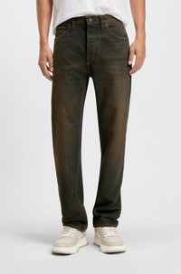 SIZE AND FIT The model wears a size 32/32 and is 6'2" tall with a, 35" chest, 27" waist and 35" hips. DETAILS In an easy straight fit, these HUGO Menswear jeans have a vintage green cast to add a creative touch to casual looks. Weighty feel denim. Regular fit Regular rise Button closure Pockets bottom front: Side pockets Straight leg Pockets bottom back: Patch pocket Standard length Fit foot width: 40,0 cm (15.7 inches) Jonah - 50547127 QUALITY & CARE INSTRUCTIONS Do Not Tumble Dry Quality: 100% Cotton, pocketing: 100% Cotton Do Not Dry Clean Machine Wash Cold Gentle Do Not Bleach Iron Medium Heat