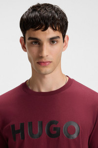 SIZE AND FIT The model wears a size M and is 6'0" tall with a, 37" chest, 28" waist and 37" hips. DETAILS A statement T-shirt by HUGO Menswear, easy to style with any casual look. Regular fit Soft cotton. Large HUGO logo print across the chest. Regular fit Neckline: Crew neck Short sleeves Dulivio - 50467556 QUALITY & CARE INSTRUCTIONS Machine Wash Cold Gentle Quality: 100% Cotton, Collar: 97% Cotton, 3% Elastane Iron Low Heat Do Not Tumble Dry Do Not Bleach Do Not Dry Clean