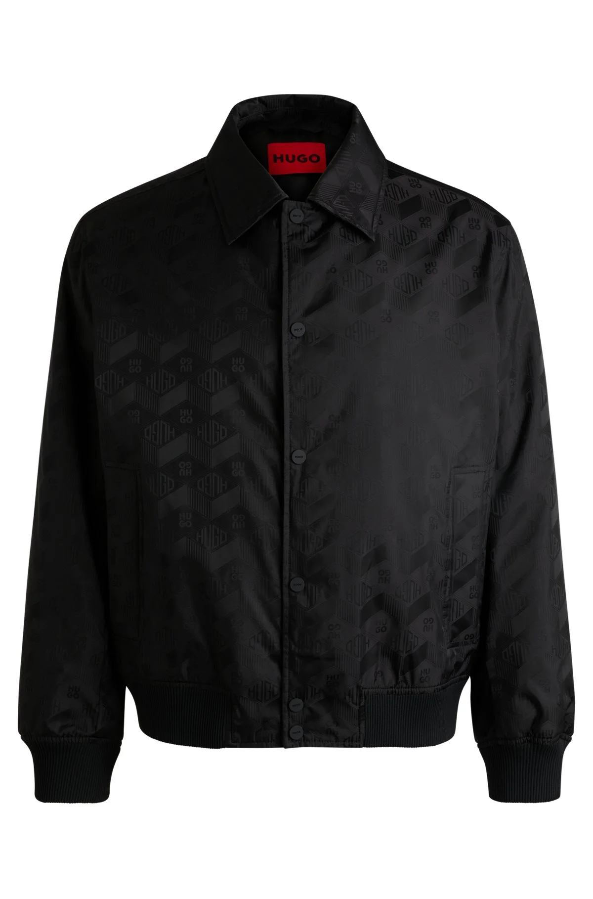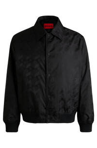 SIZE AND FIT The model wears a size M and is 6'2" tall with a, 35" chest, 27" waist and 35" hips. DETAILS Boran2521 - 50534450 A water-repellent option in unpredictable weather, this HUGO Menswear bomber jacket has a lustrous finish with geometric-patterned tonal logos. Laid-back fit. Relaxed fit Stand collar Stand collar Fastening top: Zip closure Pockets top: Zip pockets Inside zip pockets Elasticized cuffs Fully lined Standard length Fit back length: 67 cm (26 inches) QUALITY & CARE INSTRUCTIONS Quality: 100% Polyamid, Lining: 100% Polyester, Knitwear: 97% Polyamid, 3% Elastane, Wadding: 100% Polyester (94% recycled) Iron Low Heat Machine Wash Cold Gentle Tumble Dry Low Heat Do Not Dry Clean Do Not Bleach