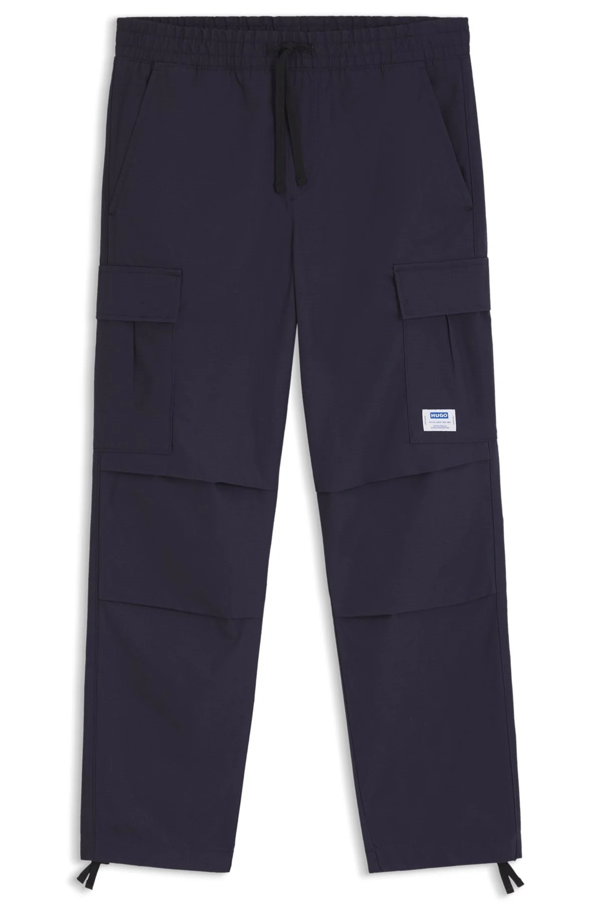 DETAILS Gadic242 - 50545643 With a laid-back fit, straight leg and adjustable cuffs, these HUGO Menswear cargo trousers are great for everyday wear. Soft ripstop cotton. Logo label. Relaxed fit Regular rise Drawstring Straight leg Pockets bottom front: Side slash pockets Pockets bottom back: Flap pocket QUALITY & CARE INSTRUCTIONS Reduced Dry Clean Machine Wash Cold Gentle Do Not Tumble Dry Quality: 100% Cotton, pocketing: 65% Polyester, 35% Cotton Do Not Bleach Iron Low Heat
