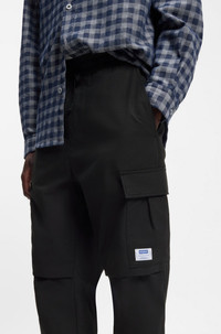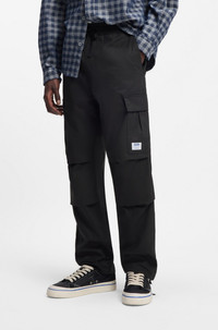 SIZE AND FIT The model wears a size M and is 6'2" tall with a, 35" chest, 27" waist and 35" hips. DETAILS Gadic242 - 50545643 With a laid-back fit, straight leg and adjustable cuffs, these HUGO Menswear cargo trousers are great for everyday wear. Soft ripstop cotton. Logo label. Relaxed fit Regular rise Drawstring Straight leg Pockets bottom front: Side slash pockets Pockets bottom back: Flap pocket QUALITY & CARE INSTRUCTIONS Quality: 100% Cotton, pocketing: 65% Polyester, 35% Cotton Do Not Bleach Do Not Tumble Dry Reduced Dry Clean Iron Low Heat Machine Wash Cold Gentle
