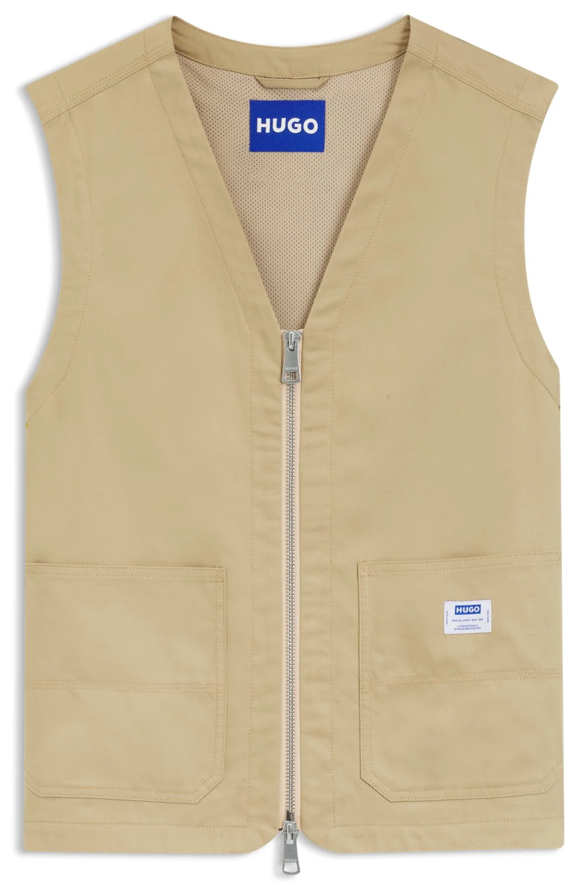 SIZE AND FIT The model wears a size M and is 6'2" tall with a, 35" chest, 27" waist and 35" hips. DETAILS In super-soft mercerized cotton, this HUGO Menswear gilet has a laid-back fit. Workwear-inspired logo label and two-way zip closure. Relaxed fit Collarless Fastening top: Zip closure Fully lined Standard length Bridger2621 - 50561178 QUALITY & CARE INSTRUCTIONS Machine Wash Cold Gentle Do Not Bleach Do Not Tumble Dry Iron Low Heat Do Not Dry Clean Material: 100% Cotton, Lining: 100% Polyester