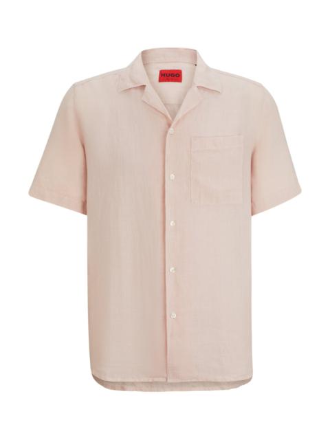 SIZE AND FIT The model wears a size M and is 6'0" tall with a, 33" chest, 27" waist and 35" hips. DETAILS Ellino - 50490761 A short-sleeved shirt by HUGO Menswear, cut to a relaxed fit in soft linen for summery comfort. Relaxed fit Reverse lapels Patch chest pockets Standard length Fit back length: 76 cm (30 inches) QUALITY & CARE INSTRUCTIONS Iron Low Heat Do Not Tumble Dry Machine Wash Cold Quality: 100% Linen Do Not Dry Clean Do Not Bleach