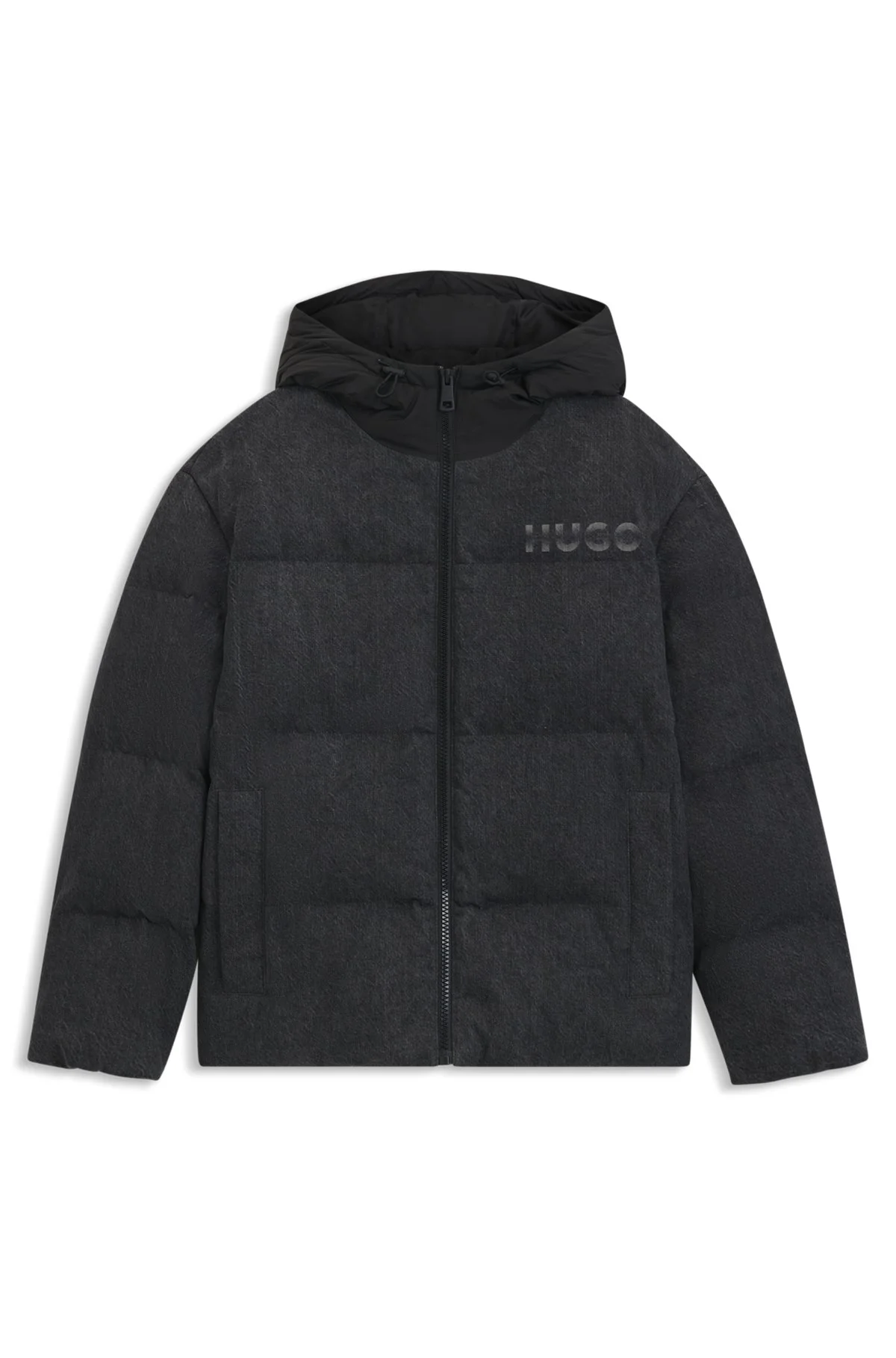 SIZE AND FIT The model wears a size M and is 6'2" tall with a, 35" chest, 27" waist and 35" hips. DETAILS Bowan254W1 - 50546769 In black denim with a vintage wash, this HUGO Menswear jacket has statement logo detailing and padding for a cozy feel. Contrast hood. Relaxed fit. Relaxed fit QUALITY & CARE INSTRUCTIONS Do Not Tumble Dry Quality: 100% Cotton, Lining: 100% Polyester, Filling: 100% Polyester, Hood: 100% Polyamide very mild professional wet clean Iron Low Heat Do Not Wash Do Not Bleach Do Not Dry Clean