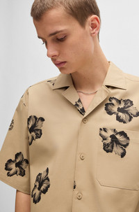SIZE AND FIT The model wears a size M and is 6'2" tall with a, 35" chest, 27" waist and 35" hips. DETAILS Eligino - 50539135 Ideal for holidays when coupled with the matching shorts, this HUGO Menswear shirt has a characterful hibiscus print. Relaxed fit in breathable stretch-cotton twill. Relaxed fit Reverse lapels Patch chest pockets Short length Fit back length: 71 cm (28 inches) QUALITY & CARE INSTRUCTIONS Do Not Bleach Quality: 98% Cotton, 2% Elastane Iron Low Heat Reduced Dry Clean Do Not Tumble Dry Machine Wash Cold Gentle