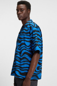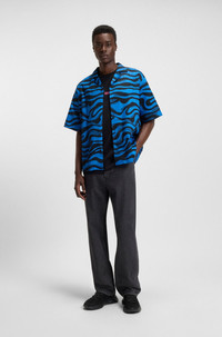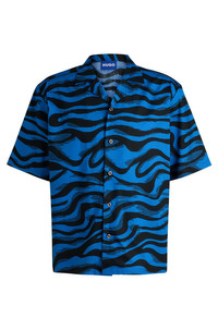 DETAILS Eligino - 50539143 Make a statement this summer in this HUGO Menswear shirt. Boxy fit in breathable poplin printed with high-impact graphics. Relaxed fit Reverse lapels Short length Fit back length: 71 cm (28 inches) QUALITY & CARE INSTRUCTIONS Machine Wash Cold Do Not Tumble Dry Do Not Dry Clean Do Not Bleach Iron Low Heat Quality: 100% Cotton
