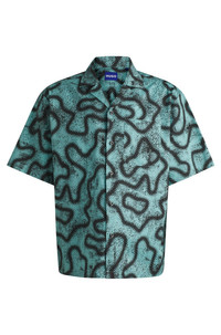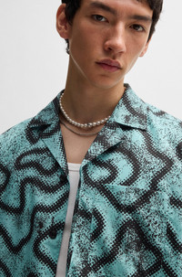 SIZE AND FIT The model wears a size M and is 6'0" tall with a, 33" chest, 27" waist and 35" hips. DETAILS Eligino - 50534201 A statement loose-fit shirt by HUGO Menswear. Printed with a graphic motif all over, this short-sleeved piece is crafted in cotton poplin. Relaxed fit Reverse lapels Patch chest pockets Short length Fit back length: 71 cm (28 inches) QUALITY & CARE INSTRUCTIONS Iron Low Heat Machine Wash Cold Quality: 100% Cotton Do Not Bleach Do Not Tumble Dry Do Not Dry Clean