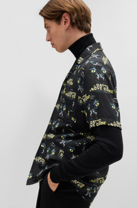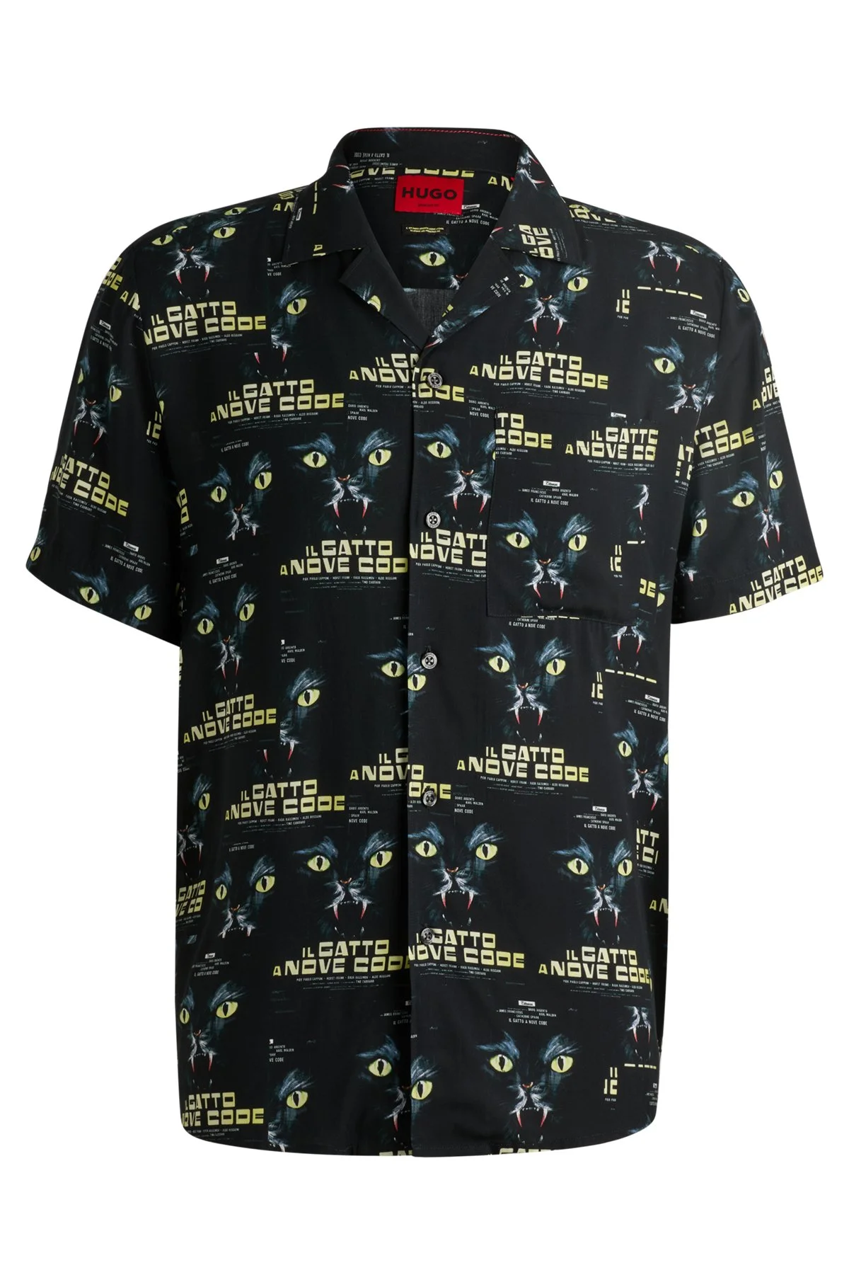 SIZE AND FIT The model wears a size M and is 6'2" tall with a, 36" chest, 28" waist and 37" hips. DETAILS Ellino - 50527413 A unique shirt by HUGO. Offered in a laid-back fit, this short-sleeved piece is printed all over with 70s film graphics. Relaxed fit Reverse lapels Patch chest pockets Standard length Fit back length: 76 cm (30 inches) QUALITY & CARE INSTRUCTIONS Do Not Tumble Dry Machine Wash Cold Do Not Bleach Quality: 100% Viscose Iron Low Heat Do Not Dry Clean