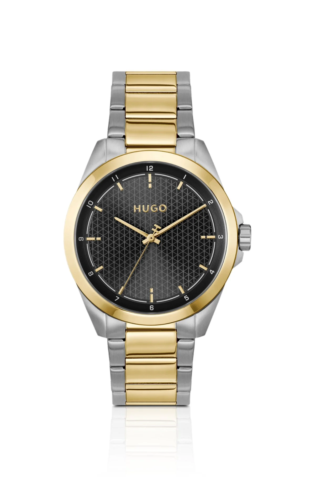 DETAILS In steel with gold and silver effects, this striking HUGO Menswear watch has a creative texture on the black dial. Cleanly integrated link bracelet. Watch mechanism: Three-hand Dial color: Black Strap material: Stainless steel Closure: Push-button deployment Case size: 1.61 in (41 mm) (0 inches) Water Resistance (in ATM): 3 ATM #SEAM - 58733314 QUALITY & CARE INSTRUCTIONS Material: 100% Stainless steel