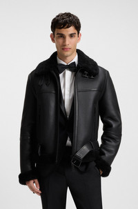 SIZE AND FIT The model wears a size M and is 6'0" tall with a, 37" chest, 28" waist and 37" hips. DETAILS Invest in an instant classic with this leather HUGO Menswear jacket, trimmed internally with plush tonal shearling. Adjustable belt. Regular fit Regular fit Inside zip pockets Standard length Larford - 50546494 QUALITY & CARE INSTRUCTIONS Do Not Bleach Material: 100% Lambskin, Insert: 100% Cow leather Do Not Wash Do Not Tumble Dry Do Not Iron Reduced Dry Clean