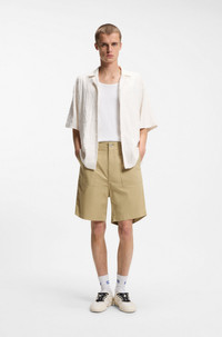 SIZE AND FIT The model wears a size 32 and is 6'2" tall with a, 35" chest, 27" waist and 35" hips. DETAILS With angled patched pockets and triple stitching, these HUGO Menswear shorts have a workwear-inspired design. Extra-soft mercerized cotton. Gutwin262S - 50556075 QUALITY & CARE INSTRUCTIONS Material: 100% Cotton Iron Low Heat Do Not Bleach Do Not Tumble Dry Machine Wash Cold Gentle Reduced Dry Clean