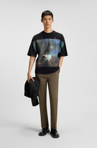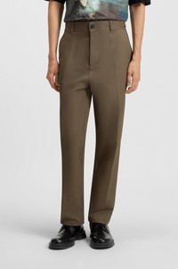 DETAILS In a contemporary slim fit that widens through the leg, these HUGO Menswear chinos are a casual essential. Brushed, mercerized cotton for elevated softness. Slim fit Regular rise Button and zip closure Wide leg Pockets bottom front: Side slash pockets Genar253 - 50541394 QUALITY & CARE INSTRUCTIONS Material: 100% Cotton, pocketing: 65% Polyester, 35% Cotton Do Not Bleach Machine Wash Cold Gentle Do Not Tumble Dry Iron Low Heat Reduced Dry Clean