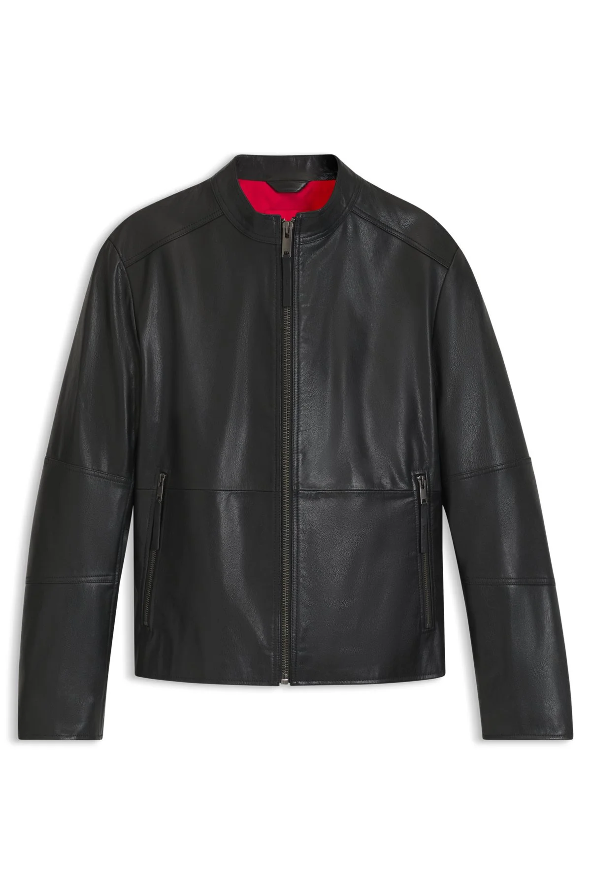 SIZE AND FIT The model wears a size M and is 6'0" tall with a, 33" chest, 27" waist and 35" hips. DETAILS Lokis-3 - 50540984 Go from work to weekend in this leather jacket from HUGO Menswear. Cleanly styled with a stand collar and slim fit. Slim fit Stand collar Stand collar Fastening top: Zip closure Pockets top: Side-entry pockets Inside zip pockets Fully lined Standard length QUALITY & CARE INSTRUCTIONS Quality: 100% Goat leather, Lining: 100% Polyester, Sleeve lining: 100% Polyester Do Not Tumble Dry Reduced Dry Clean Do Not Wash Do Not Bleach Do Not Iron