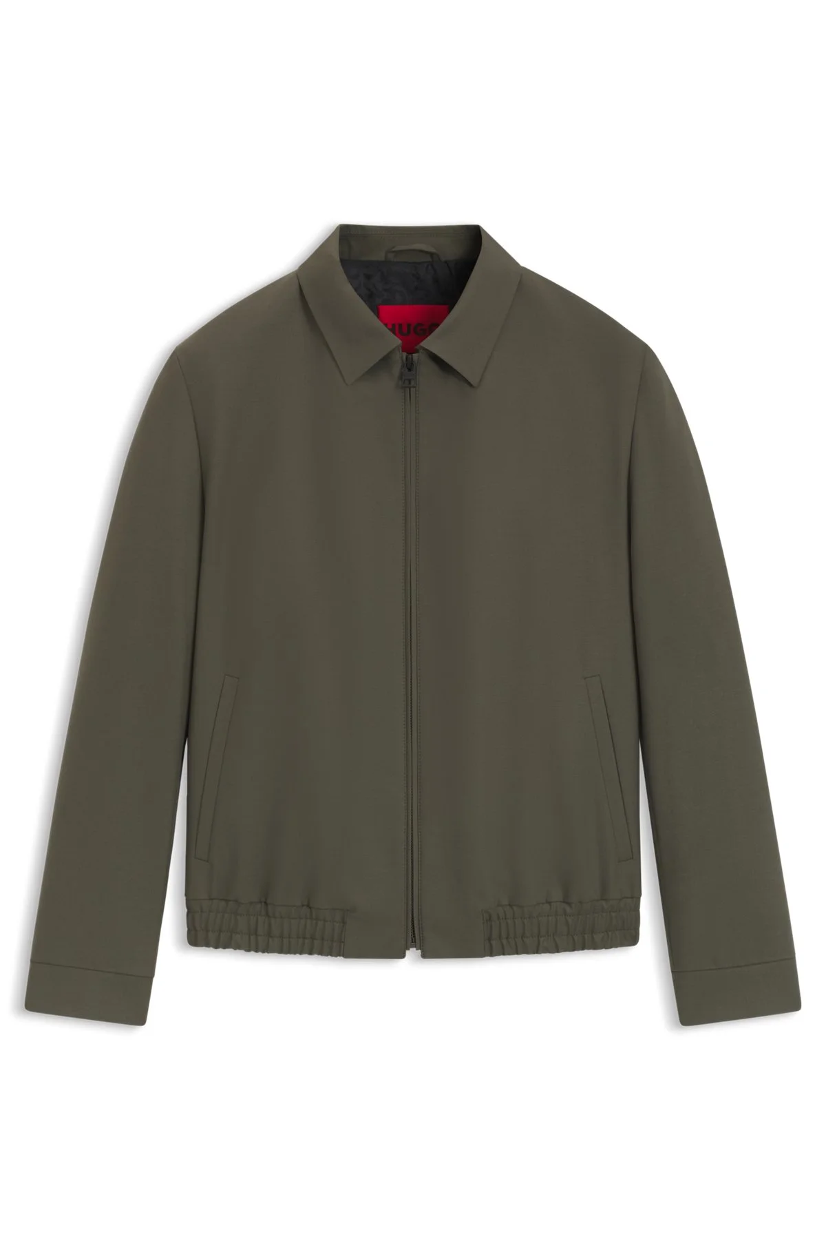 SIZE AND FIT The model wears a size 40R and is 6'2" tall with a, 31" chest, 26" waist and 35" hips. DETAILS Hellys241F1X - 50544903 Go for a casual approach with this HUGO Menswear jacket, cut to a slim fit with a front zip. Super-flex wool-blend poplin. Slim fit Fastening top: Zip closure Pockets top: Welt pockets Inside welt pockets Button cuffs Fully lined Fit back length: 66 cm (26 inches) QUALITY & CARE INSTRUCTIONS Reduced Dry Clean Do Not Bleach Do Not Tumble Dry Do Not Wash Iron Low Heat Quality: 51% Wool, 44% Polyester, 5% Elastane, Lining: 55% Polyester, 45% Viscose, Sleeve lining: 100% Polyester