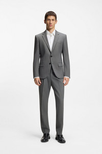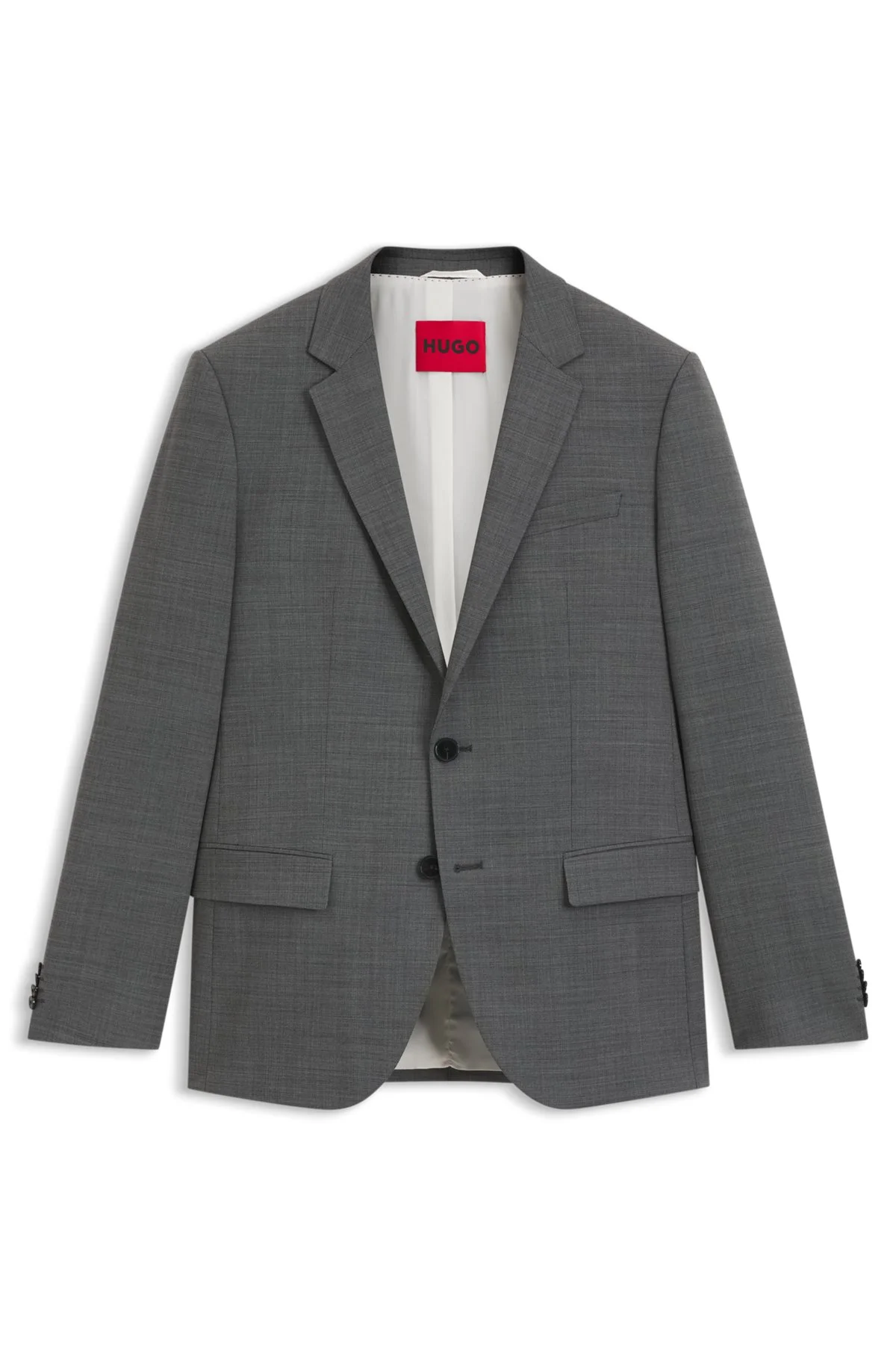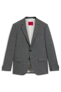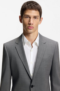 SIZE AND FIT The model wears a size 38R and is 6'2" tall with a, 36" chest, 28" waist and 36" hips. DETAILS Updating classic sharkskin, this HUGO Menswear jacket combines a slim cut with a performance-stretch wool blend. Clean notch lapels. Slim fit Fully lined Fit back length: 73 cm (29 inches) Henry232X - 50557625 QUALITY & CARE INSTRUCTIONS Iron Low Heat Do Not Bleach Do Not Wash Material: 55% Wool, 41% Polyester, 4% Elastane, Lining: 100% Polyester, Sleeve lining: 100% Polyester Do Not Tumble Dry Reduced Dry Clean