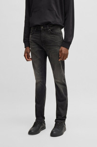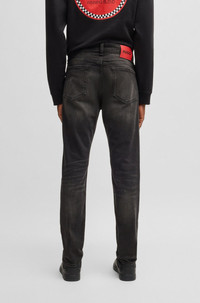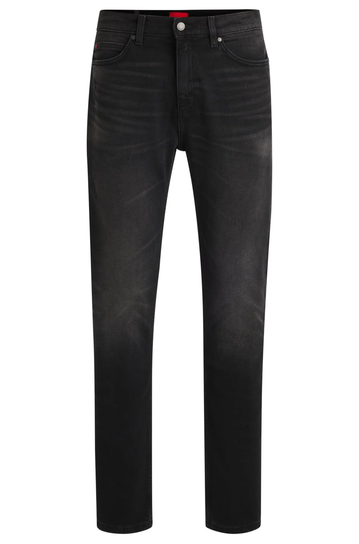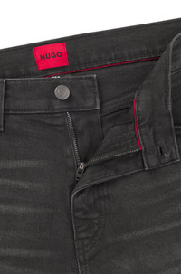SIZE AND FIT The model wears a size 32/32 and is 6'2" tall with a, 31" chest, 26" waist and 35" hips. DETAILS HUGO 708 - 50530597 Regular-rise jeans by HUGO Menswear in a slim fit with a straight leg. This pair comes in black stretch denim with a weighty feel. Slim fit Regular rise Button and zip closure Pockets bottom front: Side pockets Straight leg Pockets bottom back: Patch pocket Standard length Fit foot width: 36,0 cm (14.2 inches) QUALITY & CARE INSTRUCTIONS Machine Wash Cold Gentle Iron Medium Heat Do Not Bleach Quality: 99% Cotton (5% recycled), 1% Elastane, pocketing: 100% Cotton Do Not Tumble Dry Do Not Dry Clean