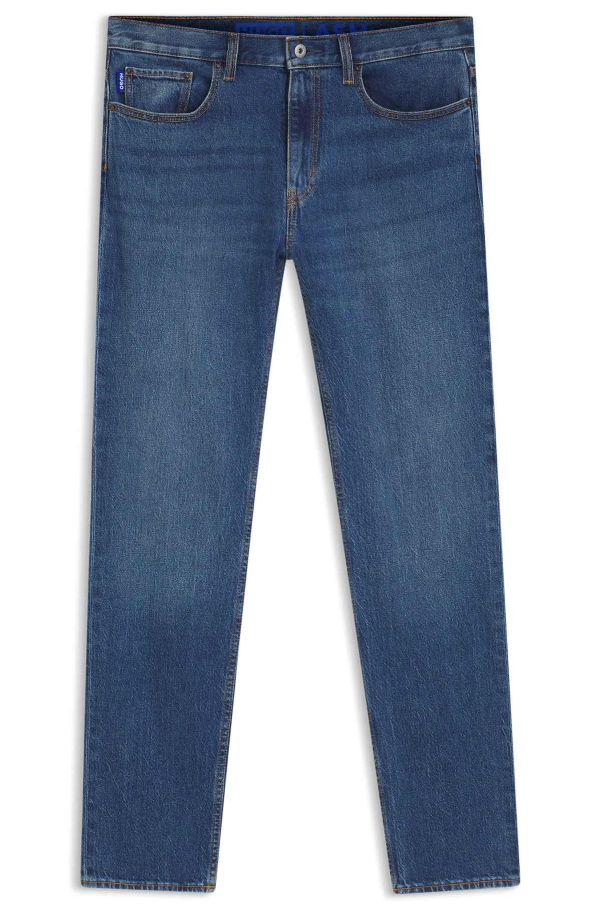 SIZE AND FIT The model wears a size 32/32 and is 6'2" tall with a, 31" chest, 26" waist and 35" hips. DETAILS Ash - 50511503 Blue jeans with signature trims by HUGO. Crafted in stretch denim for flexibility, this straight-leg pair is cut to a slim fit. Slim fit Regular rise Button and zip closure Pockets bottom front: Side pockets Straight leg Pockets bottom back: Patch pocket Standard length Fit foot width: 36,0 cm (14.2 inches) QUALITY & CARE INSTRUCTIONS Do Not Bleach Do Not Tumble Dry Quality: 99% Cotton, 1% Elastane, pocketing: 100% Cotton Iron Medium Heat Do Not Dry Clean Machine Wash Cold Gentle