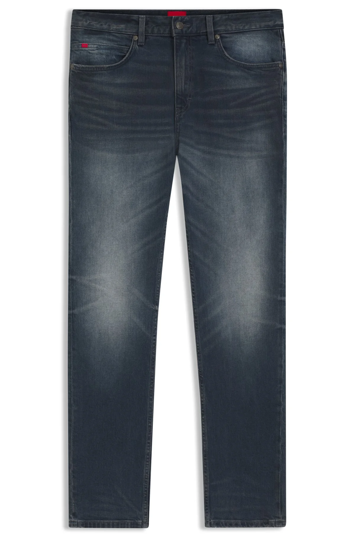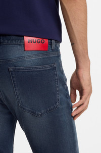 DETAILS HUGO 708 - 50547256 In a vintage-washed blue tone with soft used effects, these HUGO Menswear jeans are the casual update you need. Slim fit. Straight leg. Slim fit Regular rise Button and zip closure Pockets bottom front: Side pockets Straight leg Pockets bottom back: Patch pocket Standard length Fit foot width: 36,0 cm (14.2 inches) QUALITY & CARE INSTRUCTIONS Machine Wash Cold Gentle Iron Medium Heat Do Not Tumble Dry Do Not Dry Clean Quality: 99% Cotton, 1% Elastane, pocketing: 100% Cotton Do Not Bleach