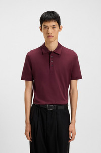 DETAILS Dimerspoly - 50544276 In mercerized-cotton jersey for an extra-soft feel, this HUGO Menswear polo shirt is perfect under a suit. Slim fit Unique four-button placket. Slim fit Neckline: Flat-knit collar Number of buttons: 4 or more buttons Short sleeves No cuffs Standard length QUALITY & CARE INSTRUCTIONS Iron Low Heat Machine Wash Cold Gentle Reduced Dry Clean Do Not Tumble Dry Quality: 100% Cotton Do Not Bleach