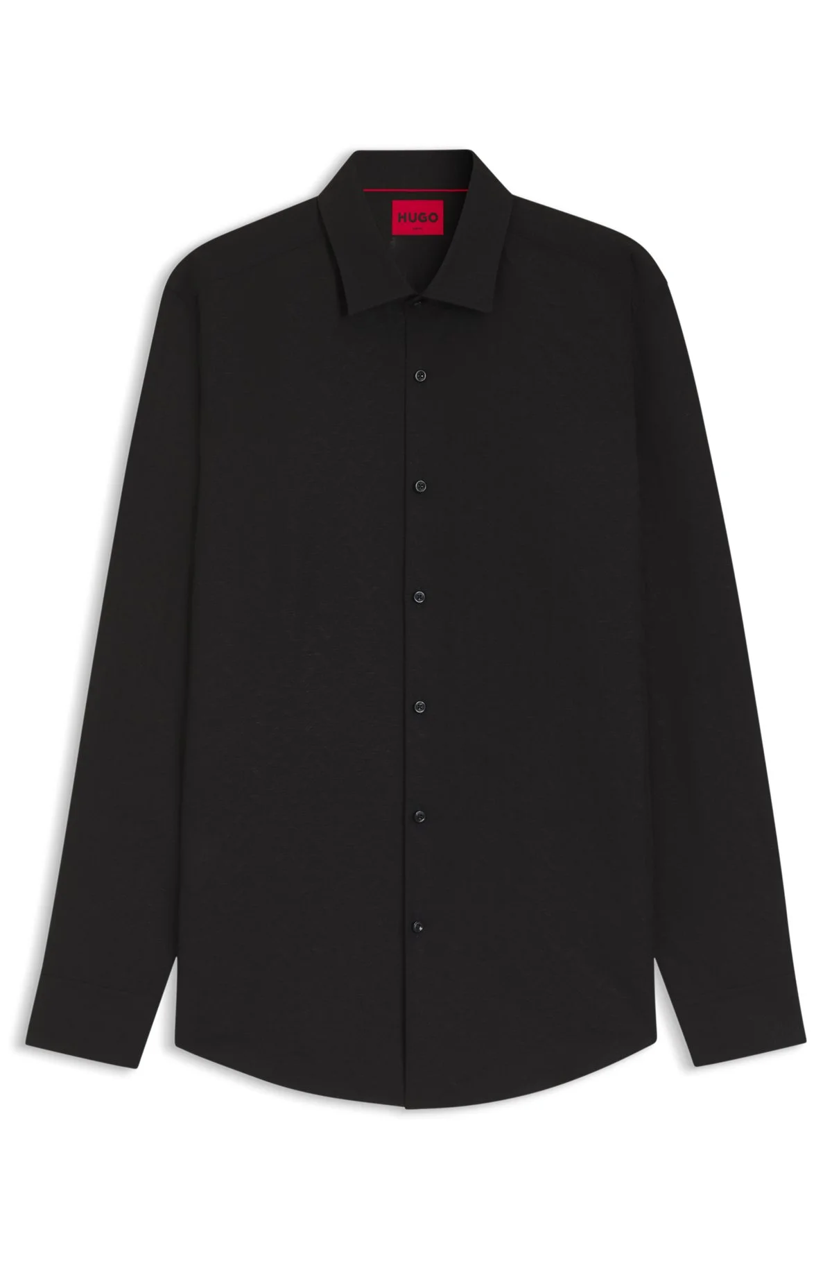 SIZE AND FIT The model wears a size EU:40 and is 6'2" tall with a, 35" chest, 27" waist and 35" hips. DETAILS With its modern chevron jacquard and slim cut, this HUGO Menswear shirt is a fresh business option. Cotton with breathable linen. Slim fit Kentkragen Barrel cuffs Standard length Kenno - 50561163 QUALITY & CARE INSTRUCTIONS Do Not Bleach Do Not Tumble Dry Material: 63% Cotton, 37% Linen Machine Wash Cold Iron Low Heat Do Not Dry Clean