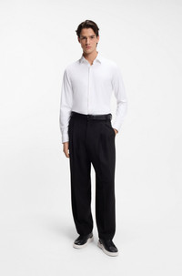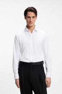 SIZE AND FIT The model wears a size 15.5 and is 6'1" tall with a, 35" chest, 27" waist and 33" hips. DETAILS Kenno - 50481195 A long-sleeved business shirt by HUGO Menswear. Crafted in performance-stretch jersey for advanced comfort, this wardrobe essential is tailored to a narrow fit for a clean profile. Signature red piping trims the inner collar to deliver typical HUGO edge. Slim fit Kentkragen Barrel cuffs Standard length QUALITY & CARE INSTRUCTIONS Iron Low Heat Machine Wash Cold Gentle Do Not Bleach Do Not Dry Clean Do Not Tumble Dry Quality: 90% Polyamid, 10% Elastane