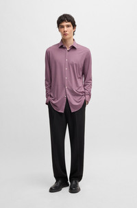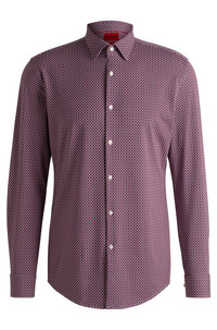 SIZE AND FIT The model wears a size 15.5 and is 6'1" tall with a, 36" chest, 29" waist and 36" hips. DETAILS Kenno - 50539731 In a streamlined fit, this HUGO Menswear shirt is a strong contender for any modern wardrobe. Crafted in performance-stretch jersey for flexible comfort. Slim fit Kent collar Barrel cuffs Standard length QUALITY & CARE INSTRUCTIONS Do Not Dry Clean Iron Low Heat Quality: 90% Polyamid, 10% Elastane Do Not Bleach Do Not Tumble Dry Machine Wash Cold Gentle