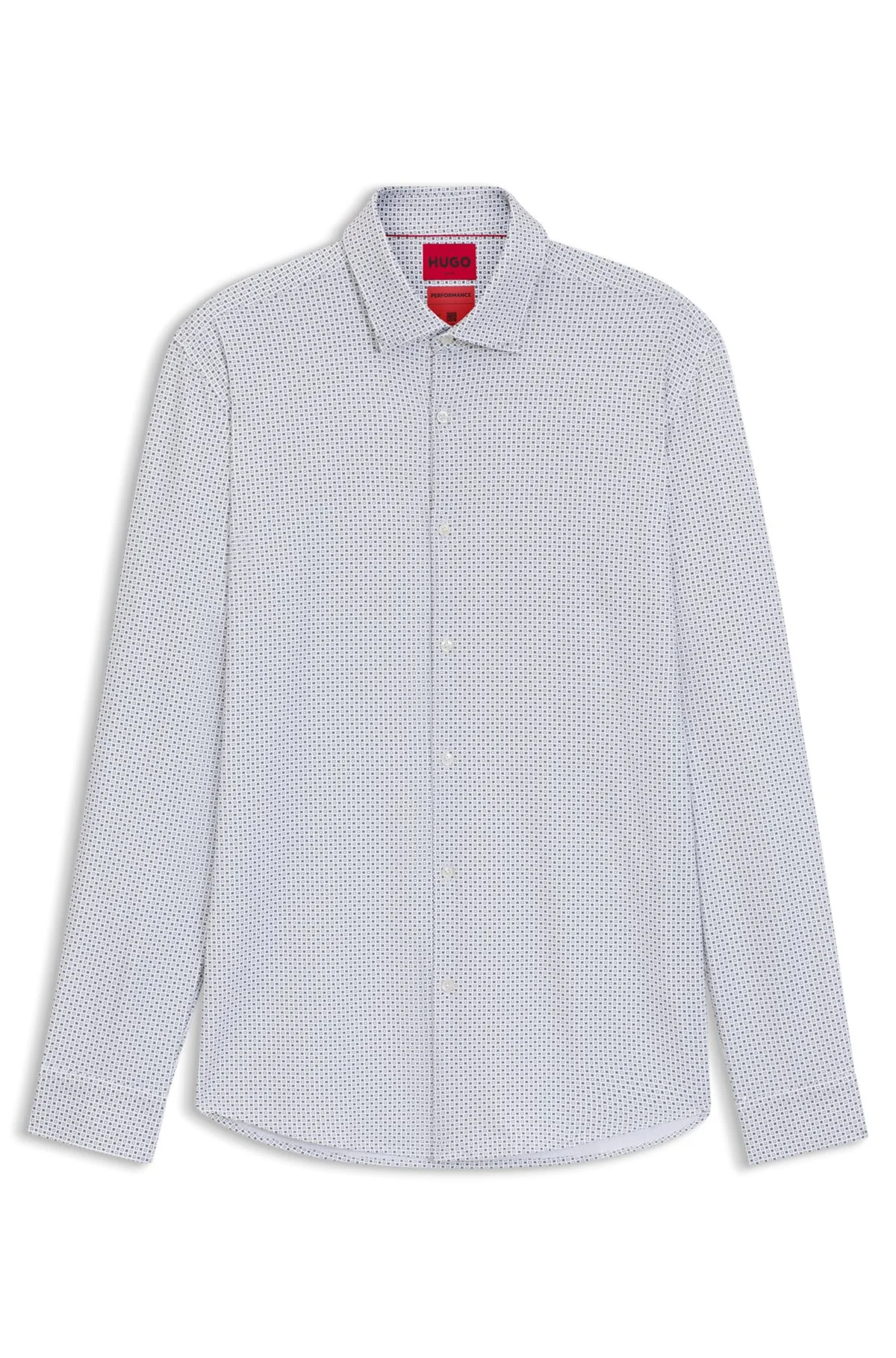 DETAILS Kenno - 50544942 Created in performance-stretch jersey, this HUGO Menswear shirt offers all-day comfort for busy days at the office. Slim fit. Modern print all over. Slim fit Kent collar Barrel cuffs Standard length QUALITY & CARE INSTRUCTIONS Do Not Dry Clean Do Not Tumble Dry Machine Wash Cold Gentle Quality: 90% Polyamid, 10% Elastane Iron Low Heat Do Not Bleach