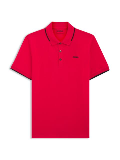 DETAILS Dinoso222 - 50467344 A slim-fitting polo shirt by HUGO Menswear, cut in stretch-cotton pique. Sporty style with a printed logo at the chest and contrast tipping. Slim fit Neckline: Flat-knit collar Number of buttons: 3 Flat-knit cuffs Standard length QUALITY & CARE INSTRUCTIONS Quality: 93% Cotton, 7% Elastane Machine Wash Cold Gentle Do Not Dry Clean Do Not Tumble Dry Do Not Bleach Iron Low Heat