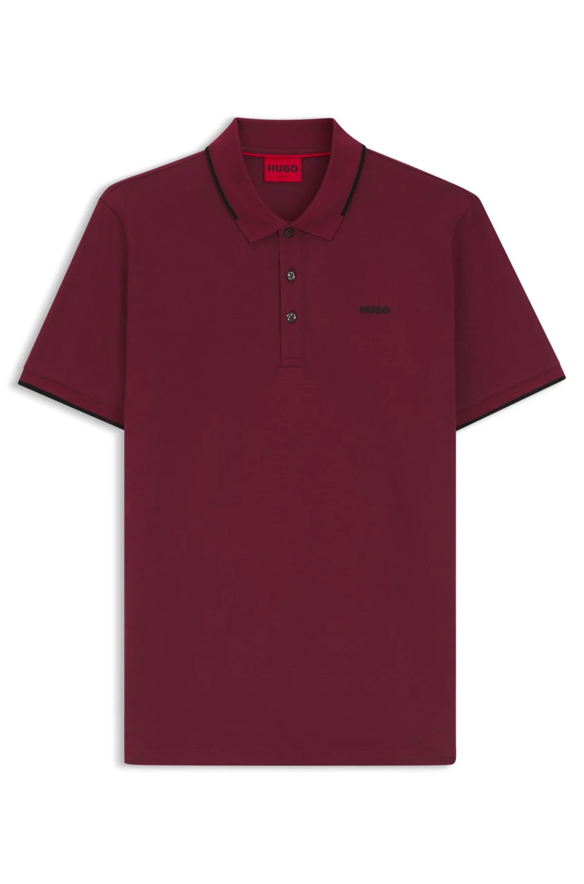 DETAILS Dinoso222 - 50467344 A slim-fitting polo shirt by HUGO Menswear, cut in stretch-cotton pique. Sporty style with a printed logo at the chest and contrast tipping. Slim fit Neckline: Flat-knit collar Number of buttons: 3 Flat-knit cuffs Standard length QUALITY & CARE INSTRUCTIONS Quality: 93% Cotton, 7% Elastane Machine Wash Cold Gentle Do Not Dry Clean Do Not Tumble Dry Do Not Bleach Iron Low Heat