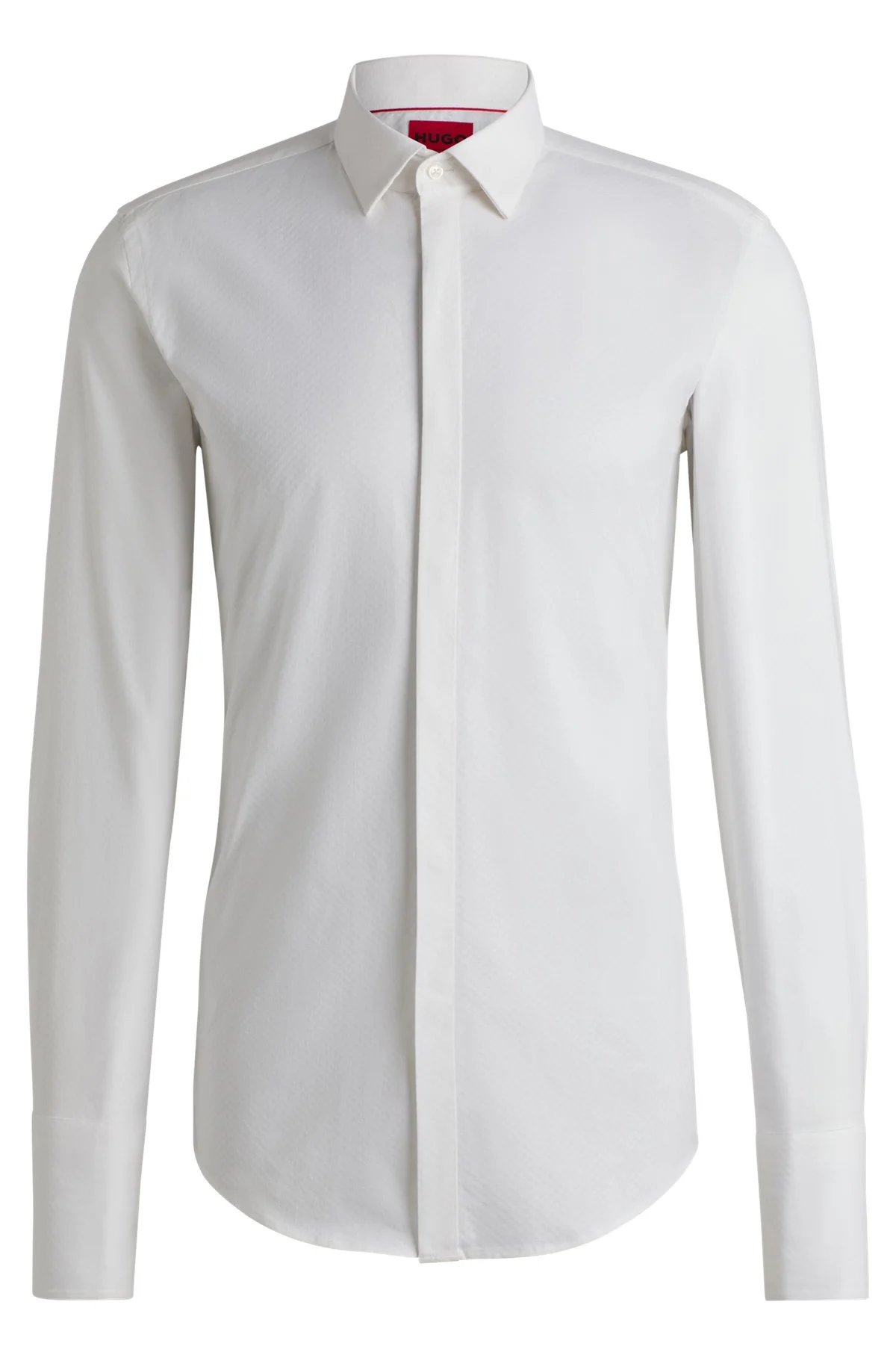 SIZE AND FIT The model wears a size EU:40 and is 6'1" tall with a, 34" chest, 26" waist and 35" hips. DETAILS Kennew - 50534103 An elegant slim-fitting shirt with a concealed placket by HUGO Menswear. This versatile piece is crafted in structured stretch fabric with double cuffs. Slim fit Kent collar Double cuffs Standard length QUALITY & CARE INSTRUCTIONS Iron Low Heat Machine Wash Cold Do Not Bleach Do Not Tumble Dry Quality: 98% Cotton, 2% Elastane Do Not Dry Clean