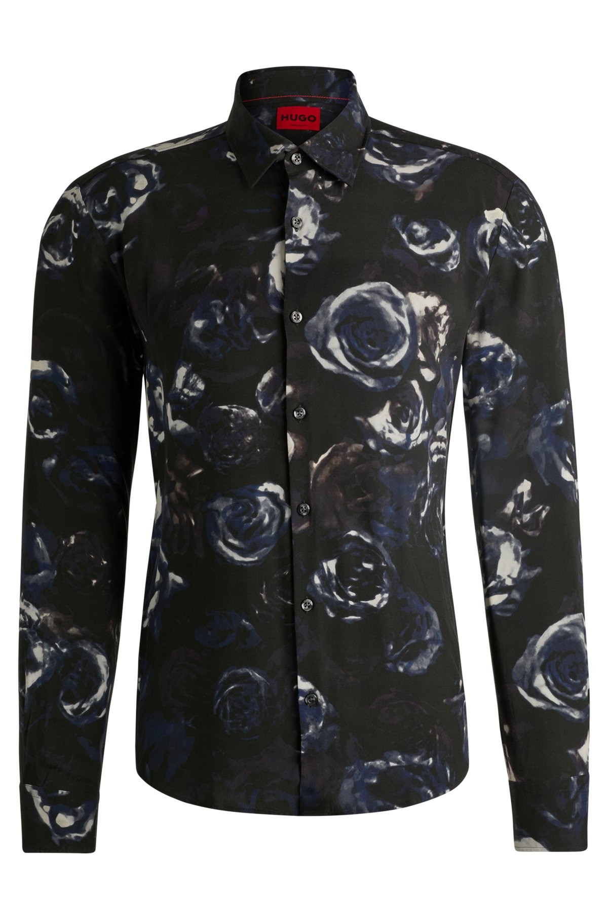 SIZE AND FIT The model wears a size M and is 6'2" tall with a, 34" chest, 29" waist and 35" hips. DETAILS Ermo - 50527471 A modern shirt with a new-season print by HUGO. This piece is tailored to a contemporary slim fit. Slim fit Kent collar Barrel cuffs Standard length Fit back length: 75 cm (30 inches) QUALITY & CARE INSTRUCTIONS Do Not Bleach Do Not Tumble Dry Machine Wash Cold Do Not Dry Clean Quality: 100% Viscose Iron Low Heat