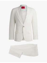 PRODUCT DETAILS - HUGO woven suit - 100% polyester - Button fastening - Blazer: slim fit, single-breasted, notch lapels, side pockets, chest pocket, long sleeves, buttoned cuffs, seersucker texture - Trousers: regular fit, mid-rise, tapered leg, belt loops, side pockets, centre creases - Dry clean - True to size - Model is 6ft 1in/1.85m and wears a size UK 38 - Midweight, non-stretch Ref: R04358466