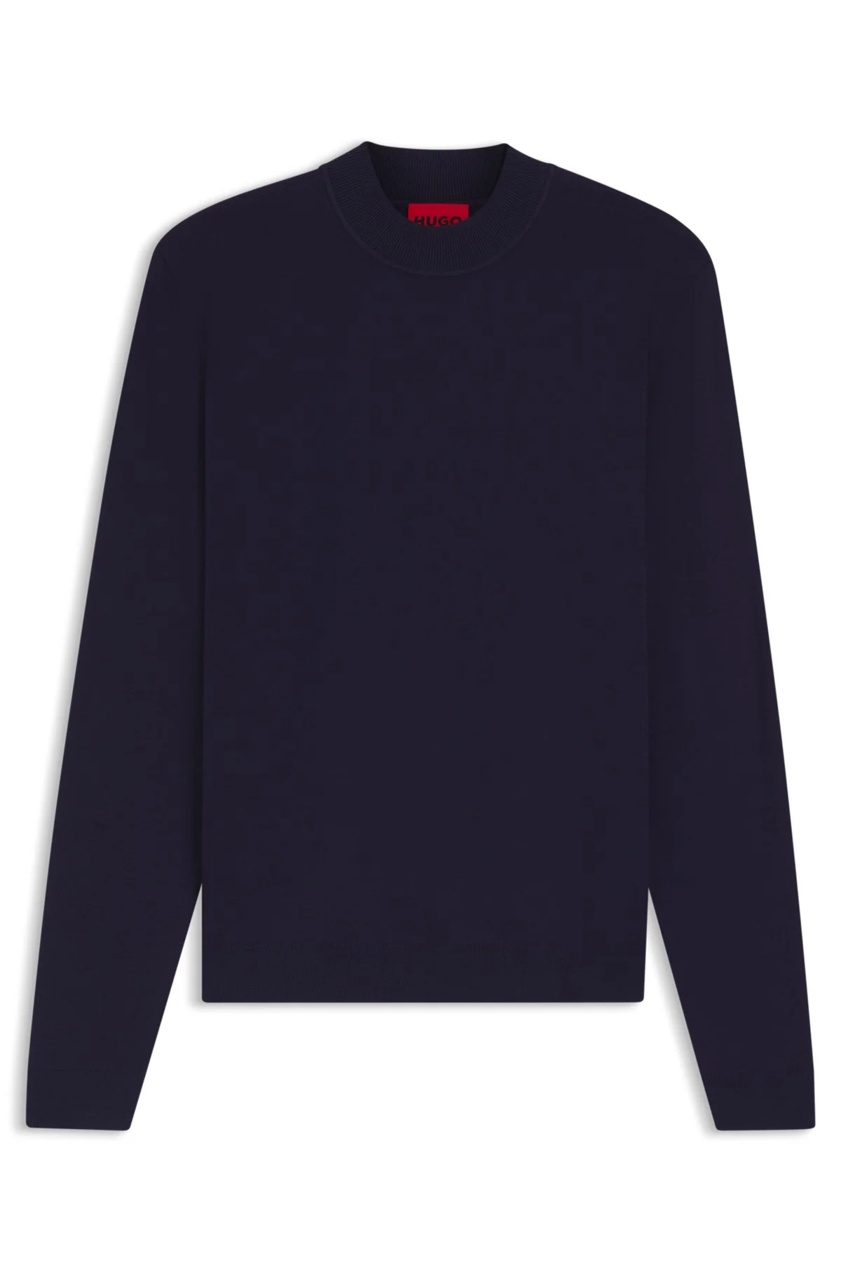 DETAILS San Marc-CV - 50546856 Featuring a high neckline with a logo at the back, this HUGO Menswear sweater is perfect for layering with tailoring. Slim fit Slim fit Neckline: Crew neck Long sleeves Standard length QUALITY & CARE INSTRUCTIONS Do Not Tumble Dry Machine Wash Cold Gentle Iron Low Heat Do Not Bleach Quality: 72% Viscose, 28% Polyester Do Not Dry Clean